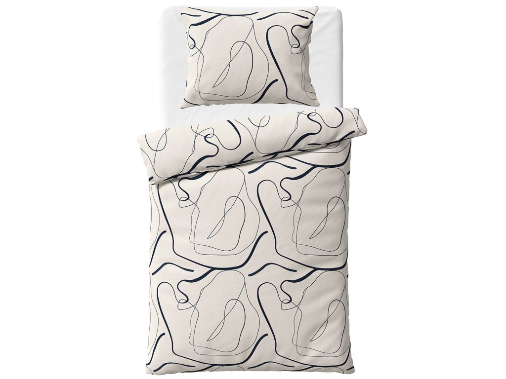Toto bavlněné povlečení kombinuje jemné krémové tóny s decentním tmavě modrým vzorem, díky čemuž působí čistě, sofistikovaně a nadčasově