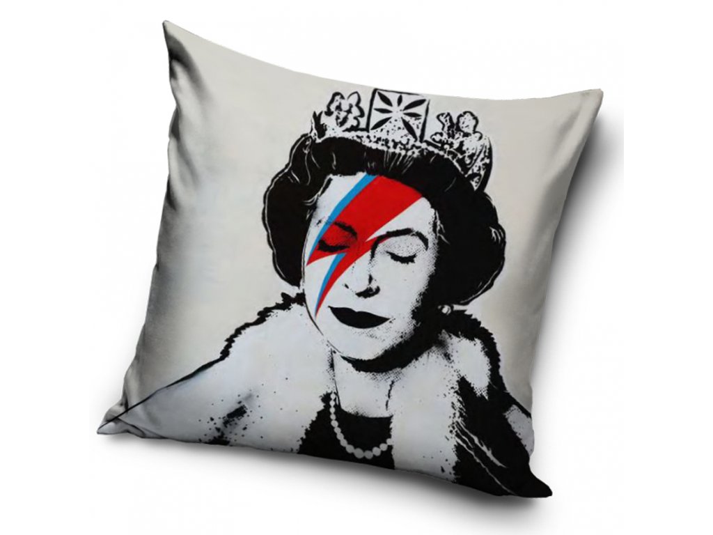 Plyšový polštářek s Královnou Alžbětou II. , která má na obličeji blesk Davida Bowie