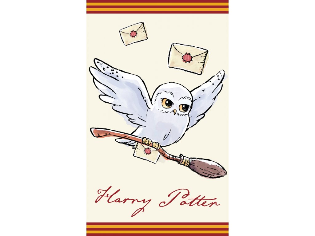 Na lícní straně ručníčku letí sova Hedvika, která nese koště a dopis