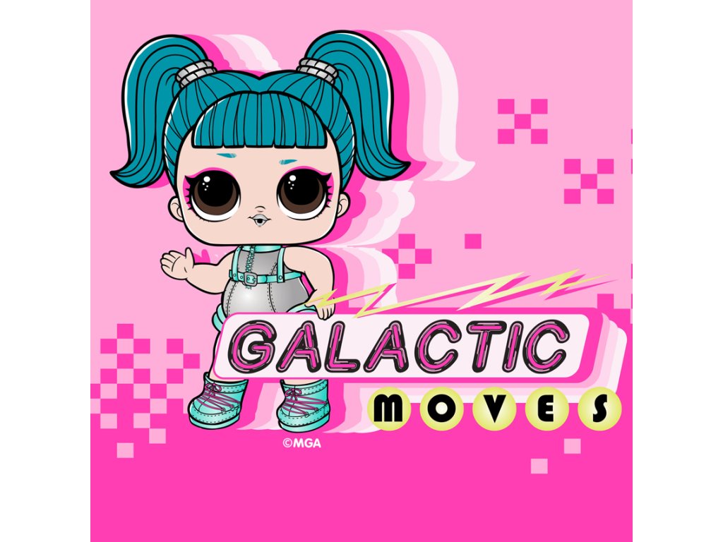 Já Vám představuji růžový ručníček s okatou Dolls, L.O.L. Surprice, která ve svém vesmírném oblečku tančí galaktický taneček