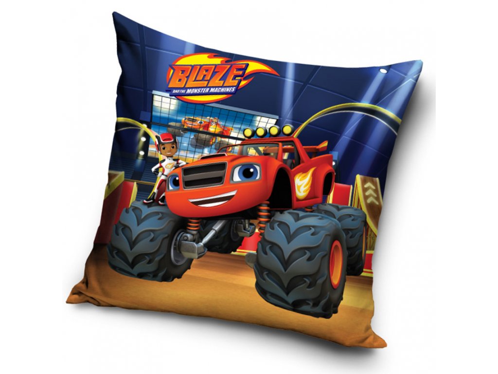 Modrý povlak na polštářek s obrázkem Monster Machines Blaze a jeho kamarád, řidič AJ, se na vás usmívá a svými velkými koly jede přímo k vám