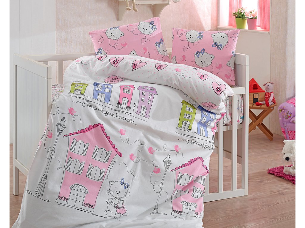 Povlečení pro malé děti, především holčičky je bílé barvy s barevnými domečky a kočičkou Miou, která je ještě vyobrazena na růžovém polštáři