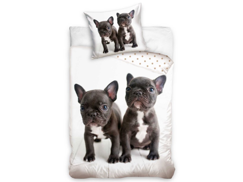 Povlak polštáře je z obou stran stejný, s buldočími štěňátky a jeho vzor a barva je shodný s lícní stranou povlaku přikrývky